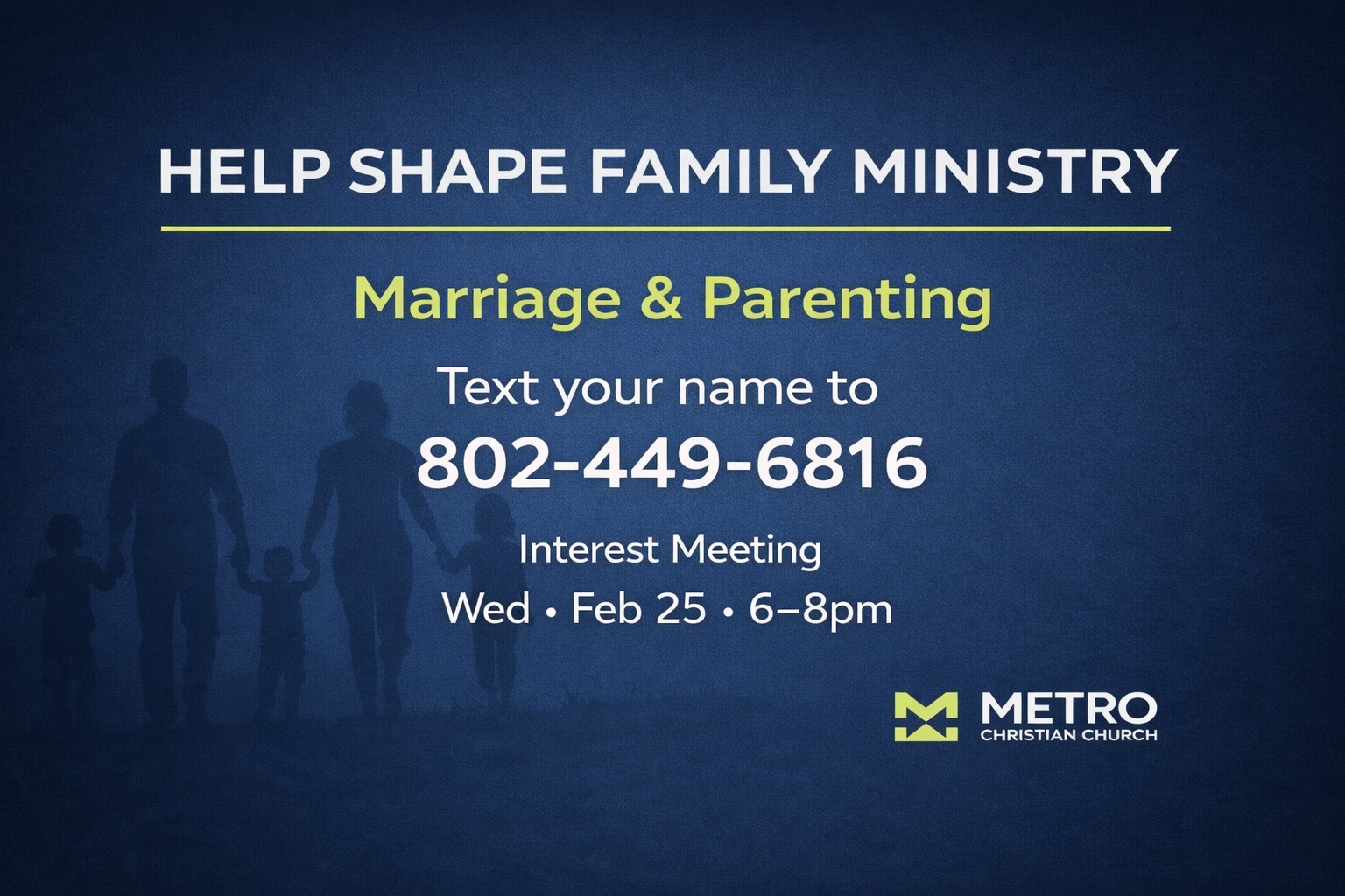 We want to learn how we can best serve you and your ‘ohana as we seek to Live Like Jesus together. You’re invited to our Family Ministry meeting on February 25th at 6pm as we hear your input on how to serve marriages and parenting here at Metro. Text your name to (802)449-6816 for more info!